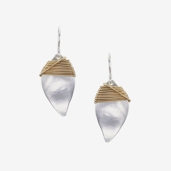 Two brass and silver interlocking pointed ribbon hoops. A beautiful wire earring with architectural shape...