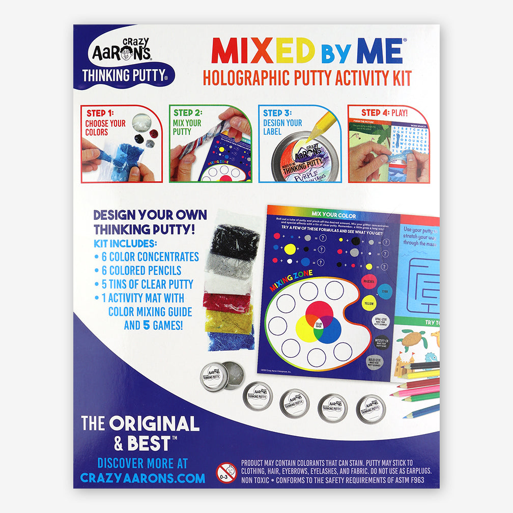 Create your own custom-colored Thinking Putty® with our DIY Holographic Mixed by Me® Kit. Each kit includes five tins of clear putty, six color concentrates, six colored pencils, and an activity mat—everything you’ll need to make cool Thinking Putty colors that sparkle all your own!