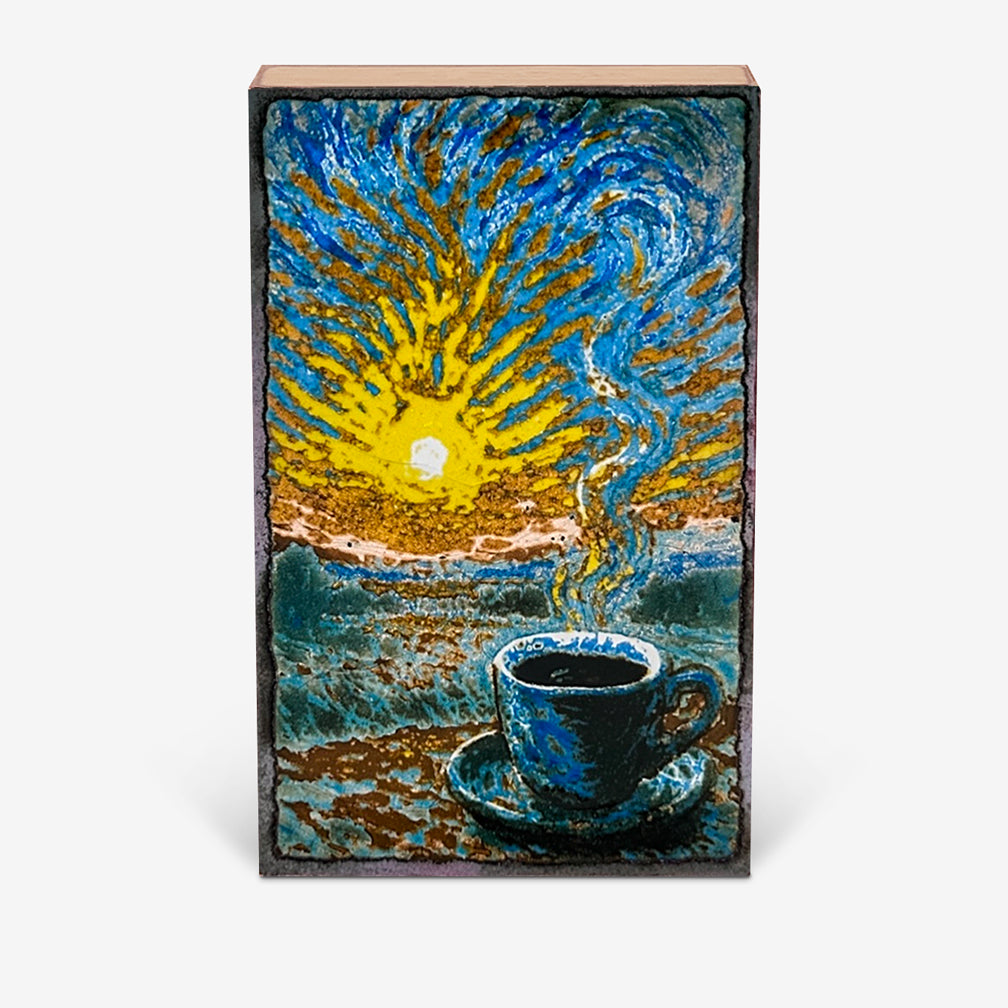 Through fortuitous circumstances, Spiritiles creator Houston Llew met the master enamelist Zingaro and learned the craft of glass enameling. His artistry has evolved from enameled imagery to a combined image and story design. This has become the cornerstone of his work.