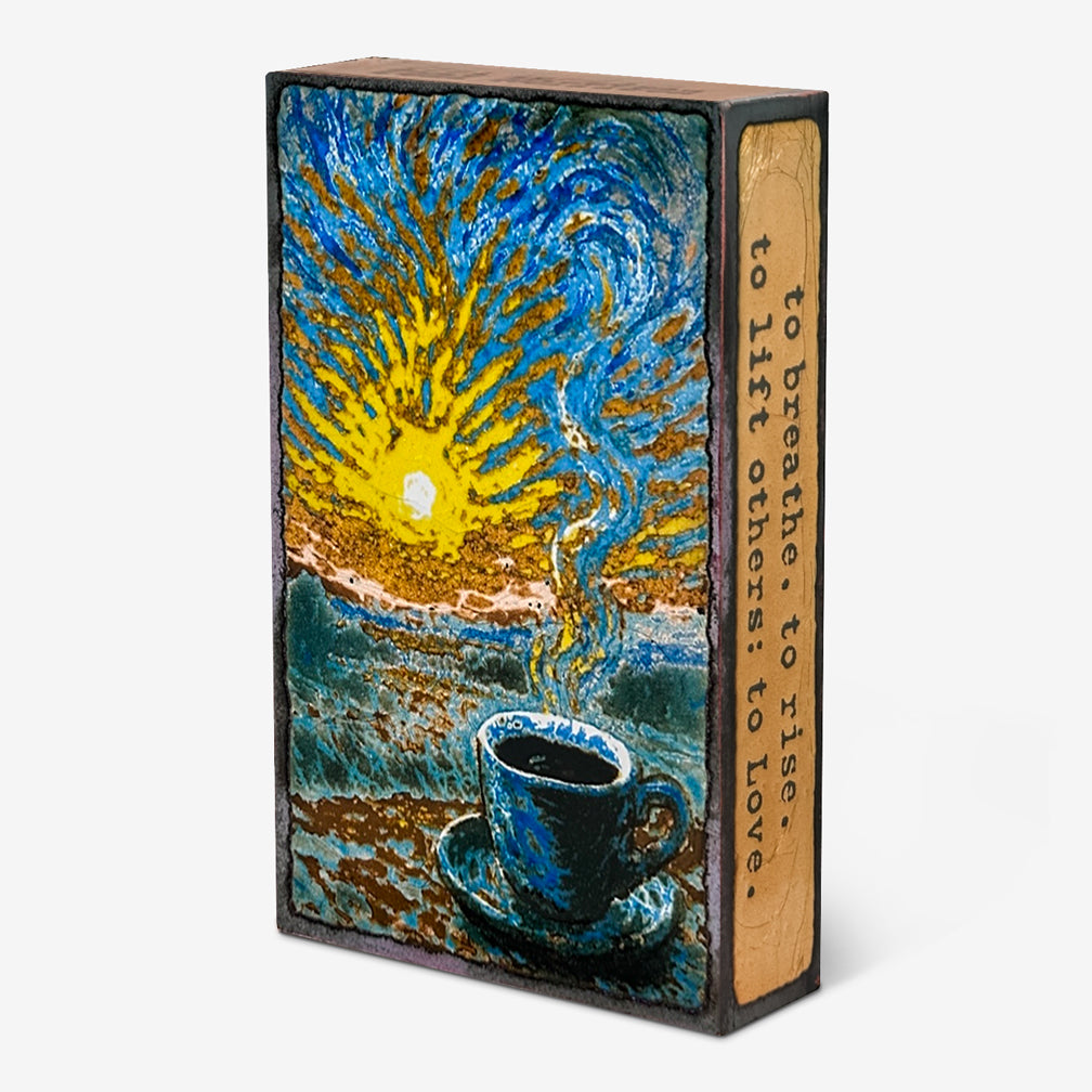 Every Spiritile has its own story that inspires, uplifts, and brings a hopeful connection to life. Handcrafted in Charleston, each is made with finely ground colored glass that is hand-painted, fused to copper in a kiln at 1500 degrees, and then wrapped around a wooden frame (see more here). Spiritiles can be hung on the wall or displayed freestanding, and withstand direct sun, humidity, and even outdoor conditions. Care and hanging information here.