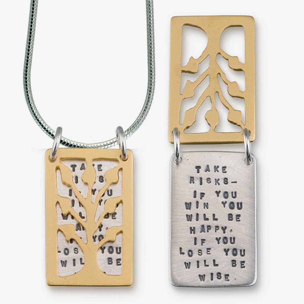 Kathy Bransfield’s Quote Necklaces open to reveal hand-stamped quotes or images that capture her trust in human faith, life’s complex beauty, and all its diversity. Hand stamped sterling silver and 22kt gold plated brass pendant. Made in California by Ohio Native Kathy Bransfield.