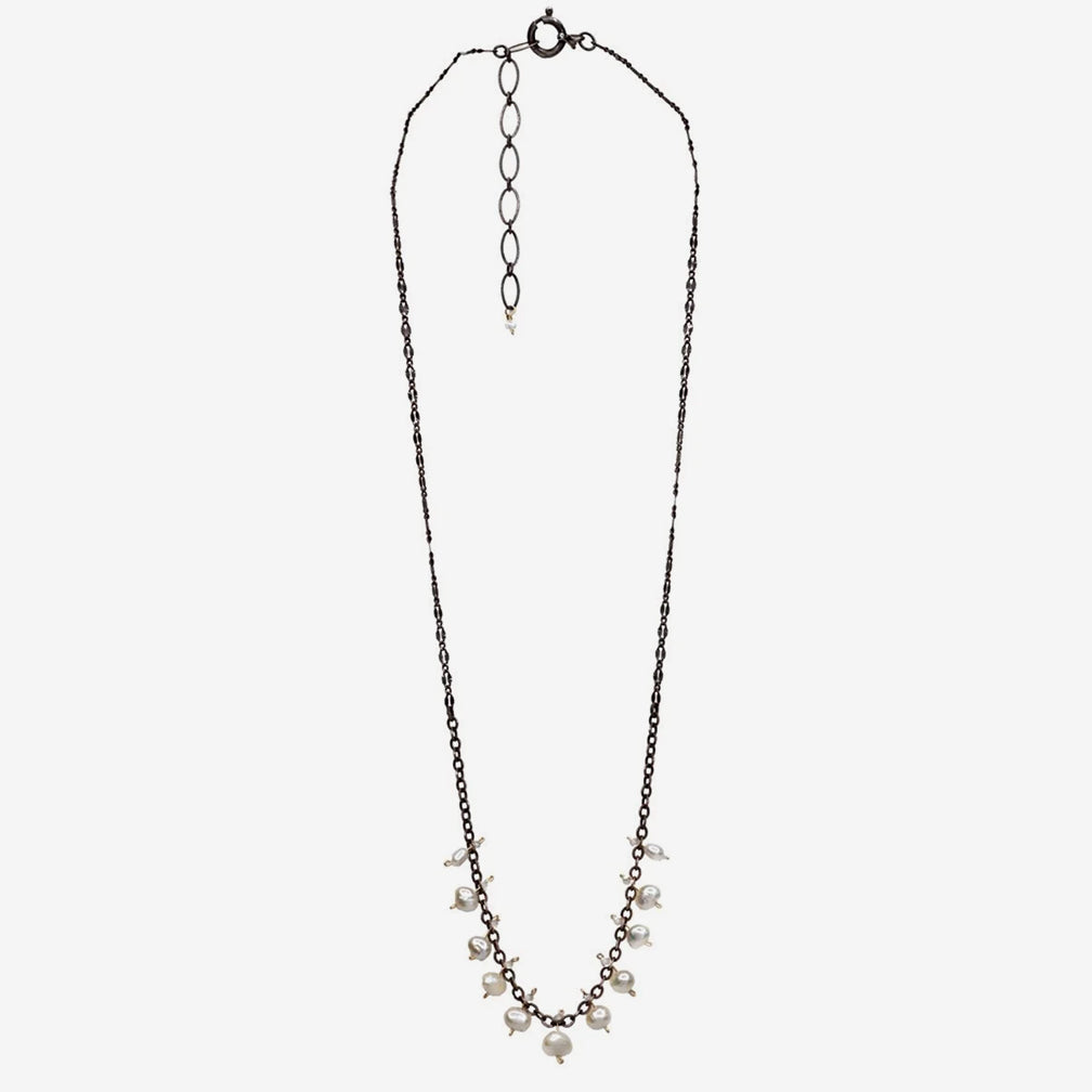 Oxidized silver chain necklace with freshwater pearls and 14k gold-filled accents.