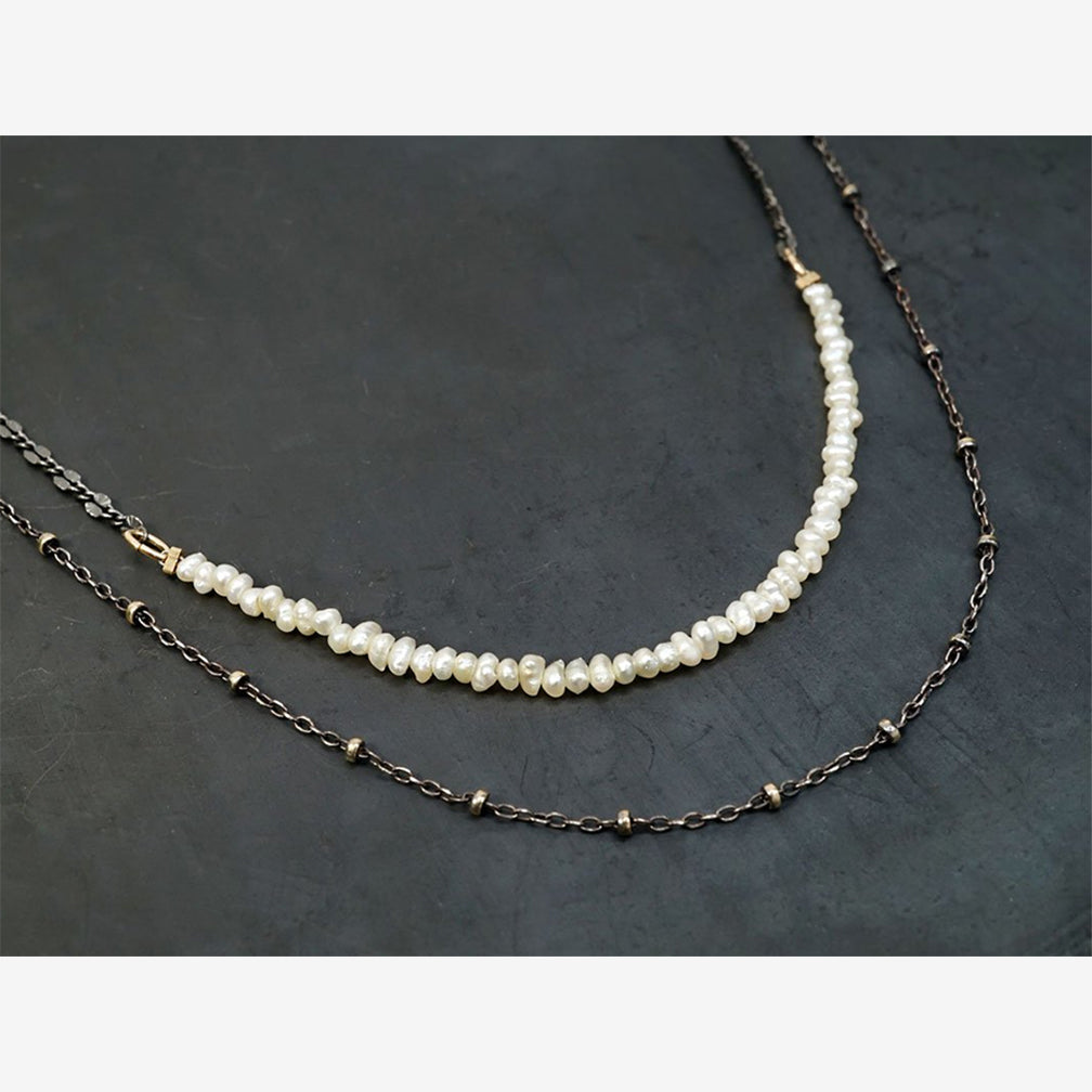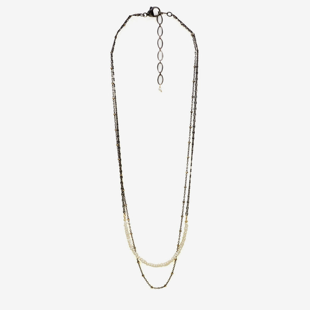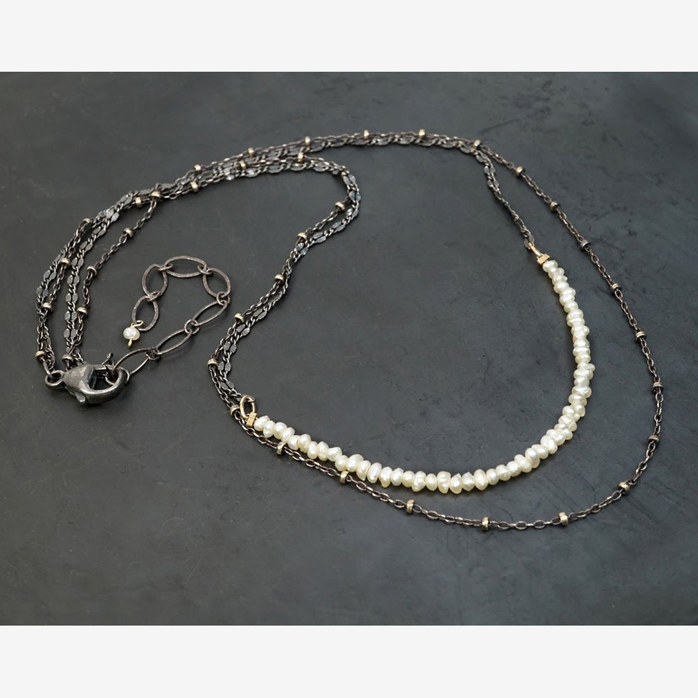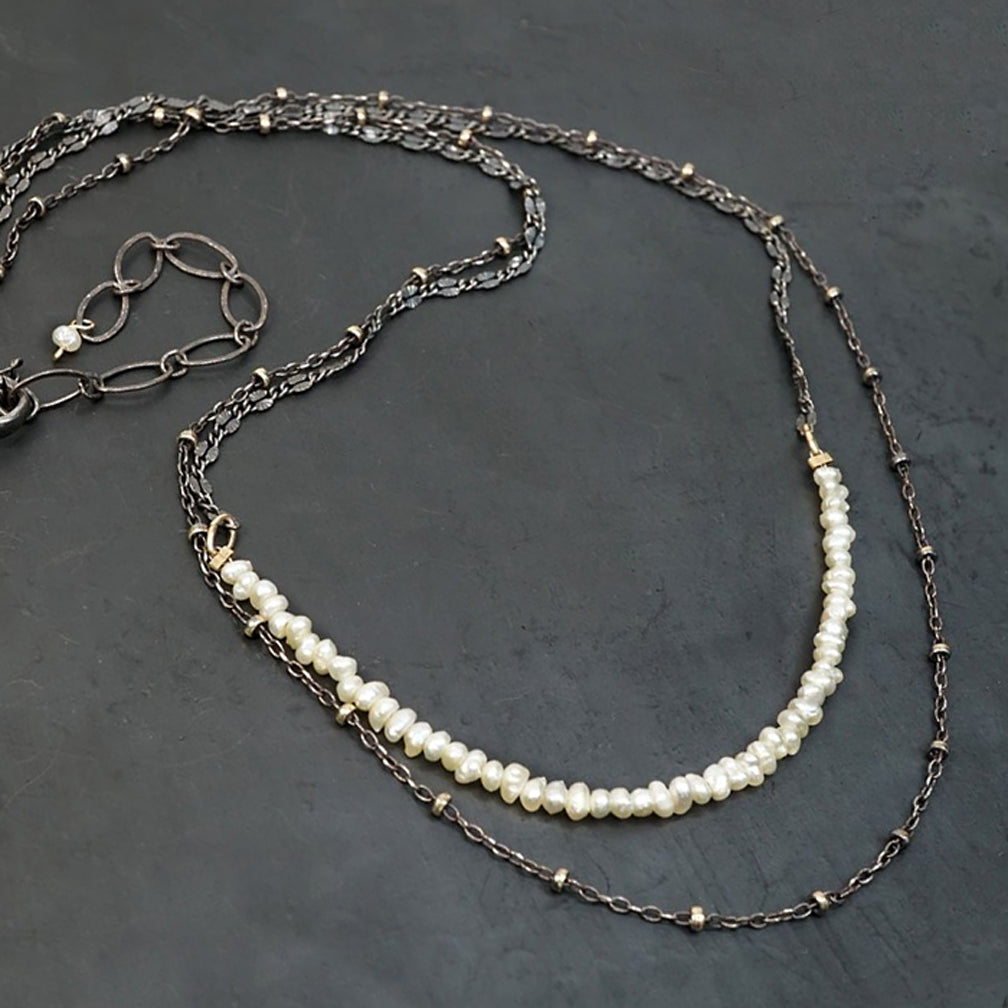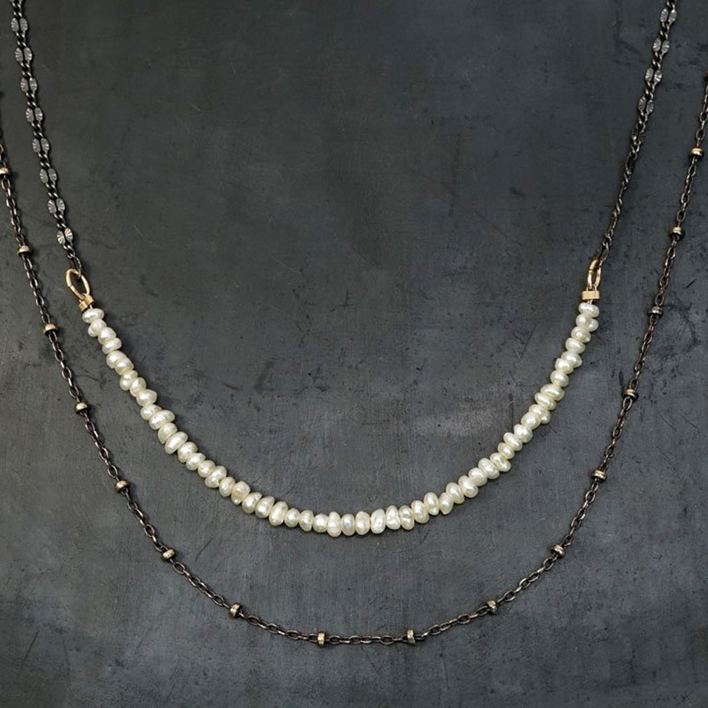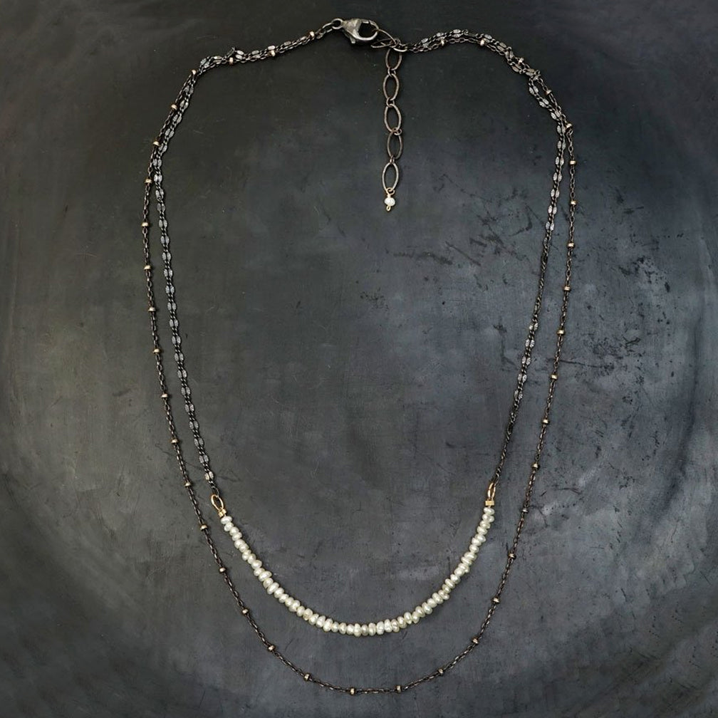Lovely layers of freshwater pearls and oxidized silver chain with 14k gold-filled accents. Take the guesswork out of layering, these two strands are already expertly layered for you!