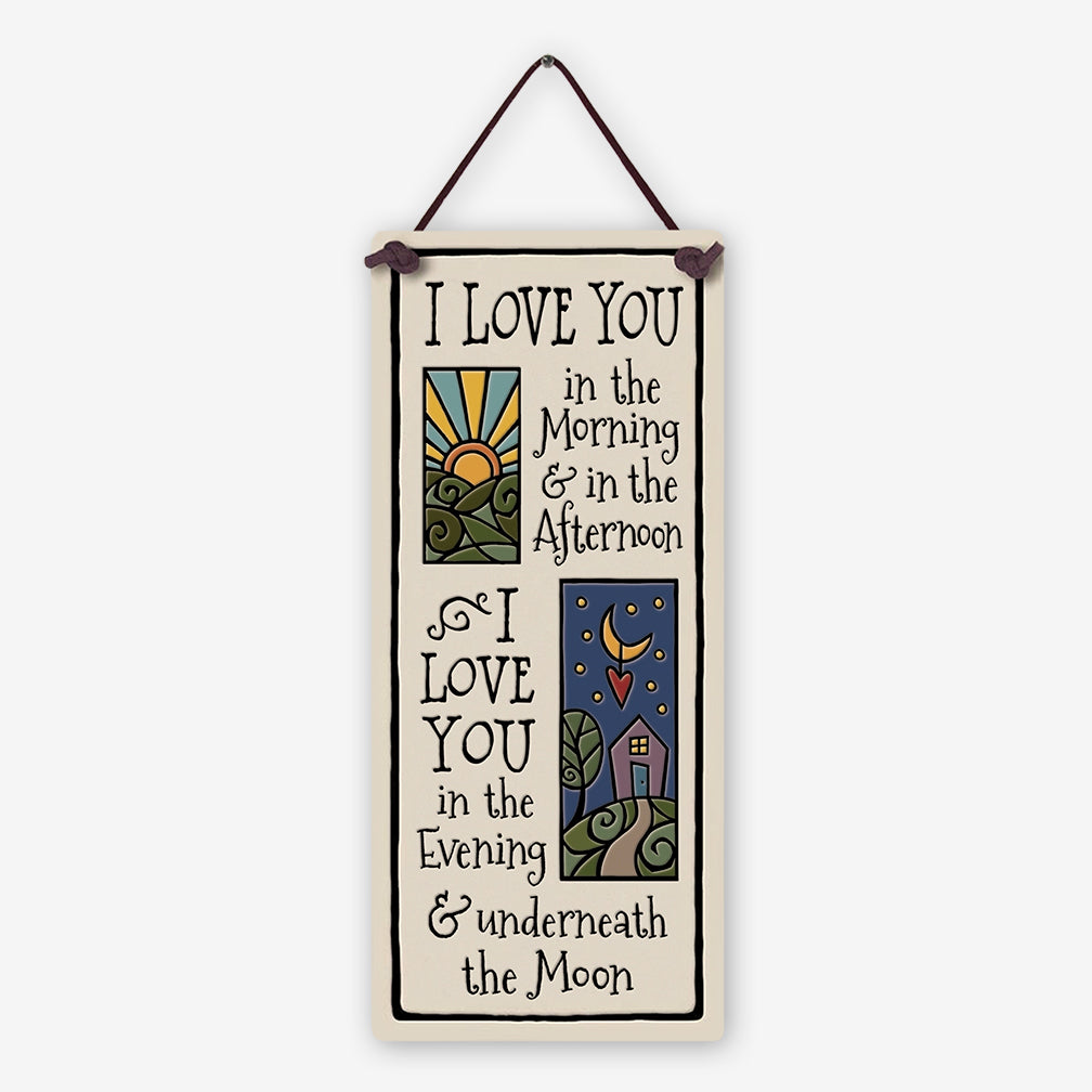 This large tall ceramic wall tile is handmade in Shell Lake, Wisconsin by the Macone family. Michael Macone developed a unique process of etching his designs into the clay, giving each tile a dimensional quality than can be appreciated by the hand as well as the eye. Each of these handmade and hand glazed clay tiles feature a vibrant image and some serious words to live by! It comes ready to hang, and is a fade proof, weather proof work of art that will last a lifetime indoors or out.
