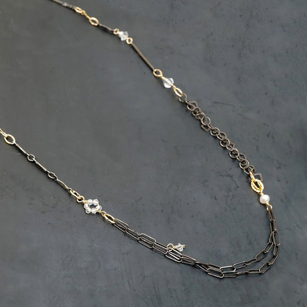 Mixed oxidized silver and 14k gold-filled chain with sparkly quartz accents. There are so many...