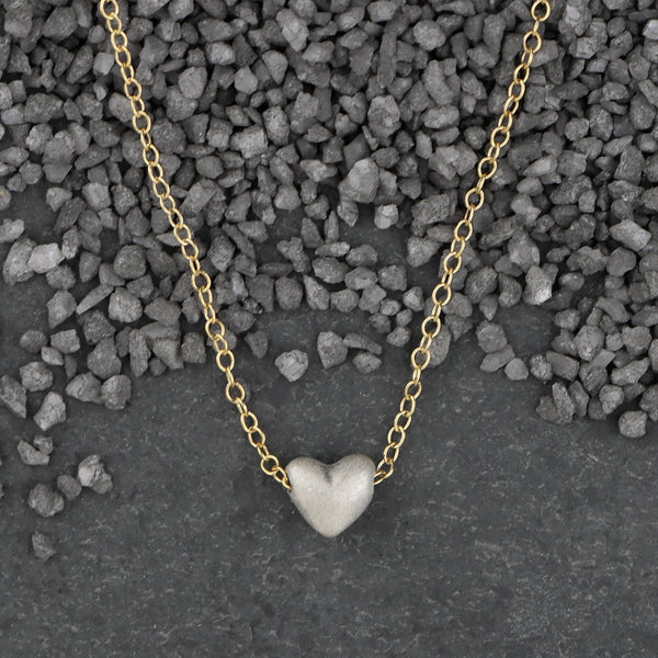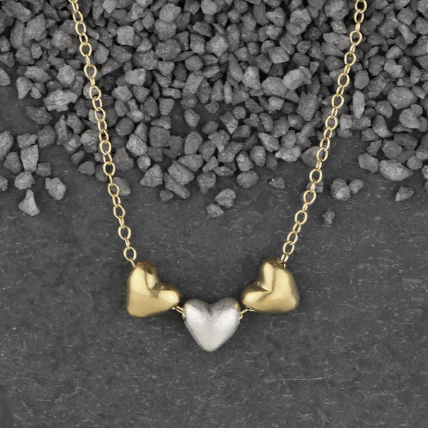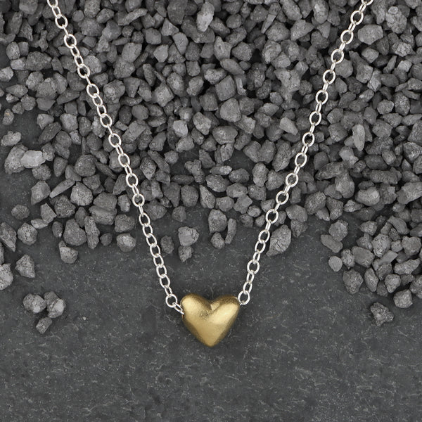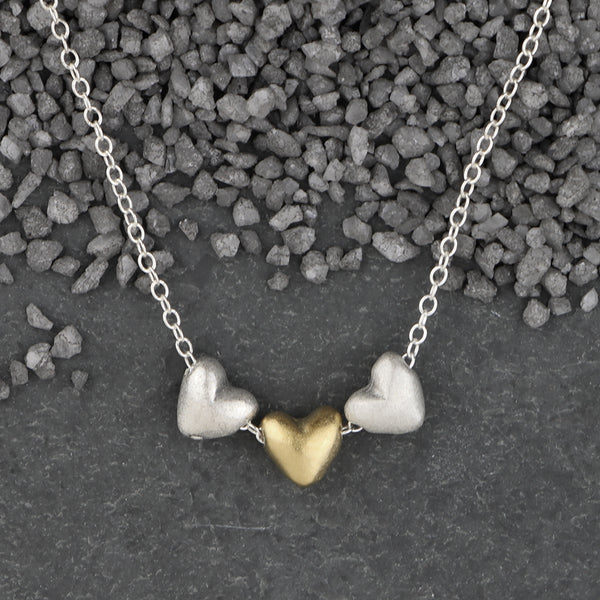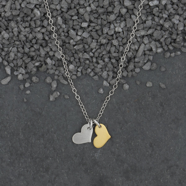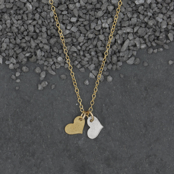 A tiny sterling silver heart with a small 23kt gold vermeil heart, both with hand-brushed...