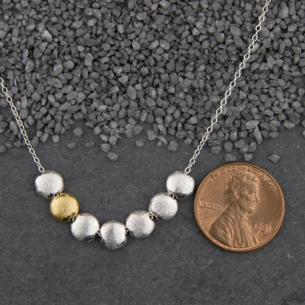 Six sterling silver microcoins and one 23kt gold vermeil accent microcoin, all with hand-brushed matte finishes, floating on fine baby chain