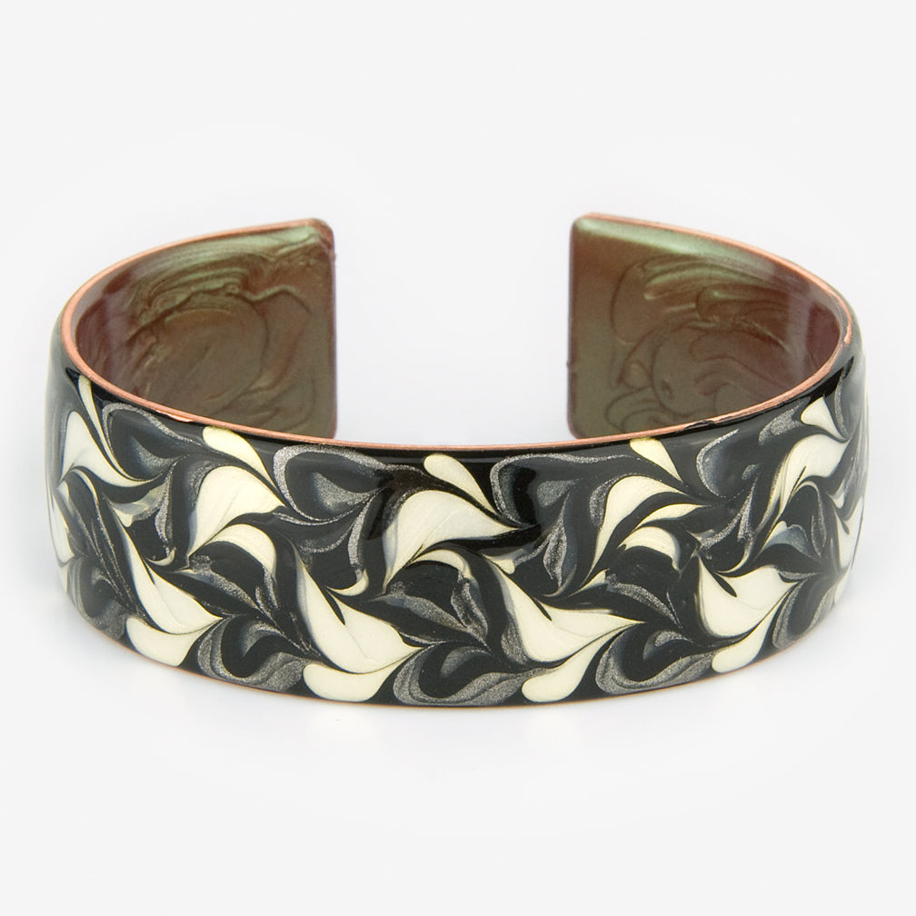 In creating each Copper FaCuff, Ava Austin cuts, shapes, and prepares a flat sheet of copper to her specifications. Next, she hand paints each one with her proprietary polymer, called FaPaint. Finally, the flat piece of copper is hand forged into a cuff. Each Copper FaCuff is adjustable to any size comfortable on the wrist. This Leaves Copper FaCuff is water resistant and signed by the artist.