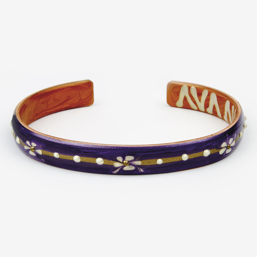 In creating each Copper FaCuff, Ava Austin cuts, shapes, and prepares a flat sheet of copper to her specifications. Next, she hand paints each one with her proprietary polymer, called FaPaint. Finally, the flat piece of copper is hand forged into a cuff. Each Copper FaCuff is adjustable to any size comfortable on the wrist. This Narrow Flowers Copper FaCuff is water resistant and signed by the artist.
