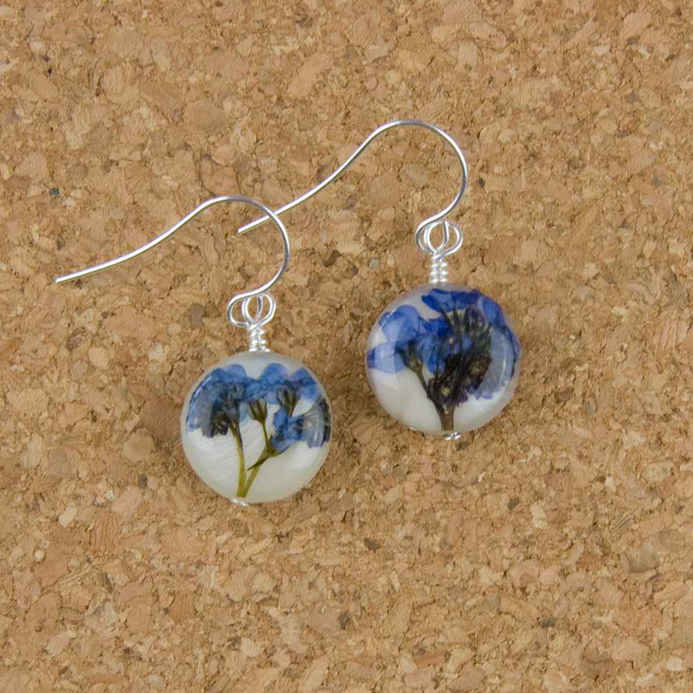 Genuine pressed Forget Me Not is preserved in resin on shell with silver plated earwires.