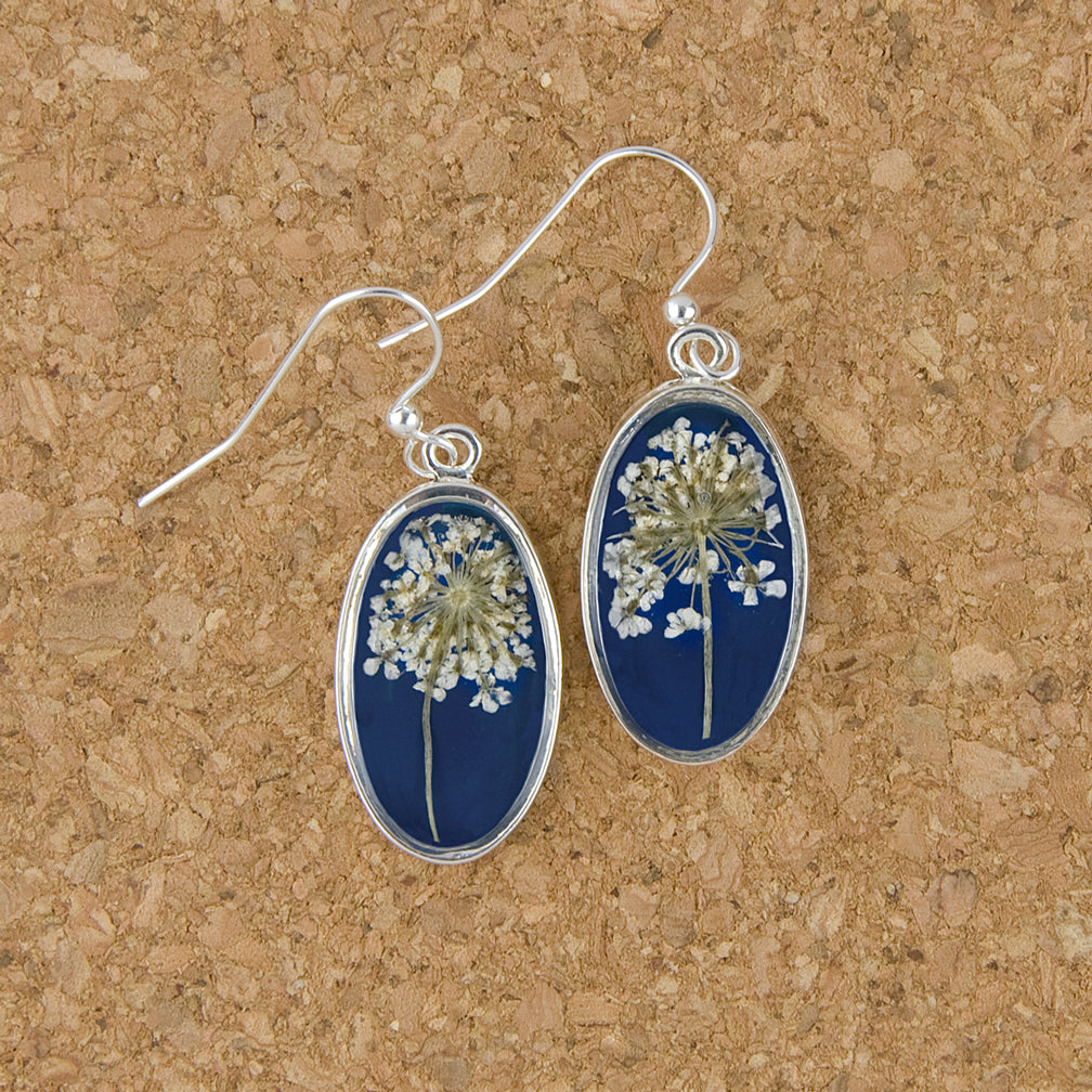 Genuine pressed Queen Anne’s Lace is preserved in resin and set in a silver plated pewter bezel.