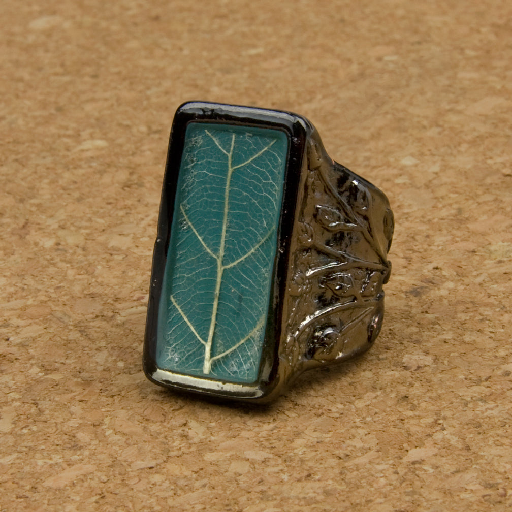Genuine pressed Damiana Oak Leaf is preserved in resin and set in a gun metal finished bezel. See the photos for possible variations—each one is unique!