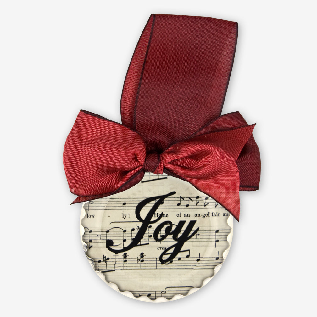 These gorgeous ornaments are made from hand cut letters and illustrations mounted on 18th and 19th century sheet music from old church hymnals. Handmade in Michigan by Jan Blough, each holiday word is encased in beveled glass, finished with hand applied silver molding and accented by an elegant red ribbon. Sure to become a treasured family heirloom, these beautiful ornaments are a visual feast of language, history, music, and holiday spirit.