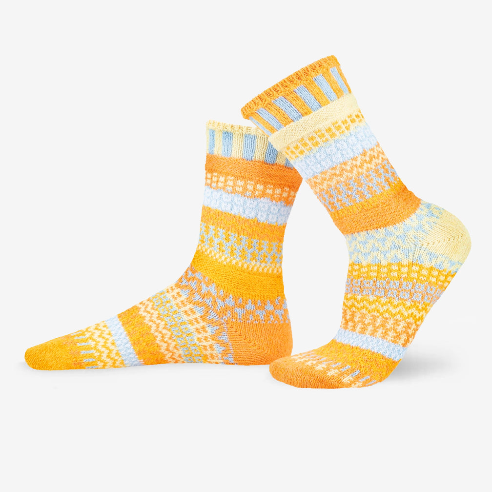 These cozy, colorful Solmate Socks are a perfect mismatch: sharing the same hues and the same pattern, each sock exchanges colors for a fabulously fun take on the classic case of mismatched socks. These socks come in sets of two. 62% Recycled Cotton, 22% Recycled Polyester, 15% Nylon, 1% Lycra.